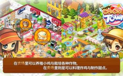《快乐的鸡镇》是一个农场与卖场相辅相成来经营的游戏,在农场里可以养殖小鸡与栽培各种作物,在卖场里则是可以料理炸鸡与制作甜点。