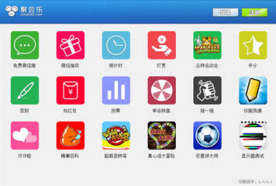公司年会都要准备很多节目,有了聚会乐软件,您再也不用担心没有好玩的节目和公司的同事们一起玩了,抽奖、砸金蛋、对对碰、脑筋急转弯、真心话大冒险、你画我猜都可以让现场嗨起来!