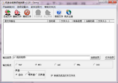 极速全能音频转换器是一款简单实用的音频格式转换工具,软件操作简单,性价比高,可以帮助用户轻松实现mp3、wma、wav、ogg、acc等各种音频格式之间的转换,支持批量转换、支持声道选择,且转换速度快,需要的朋友不要错过,快下载试试吧!