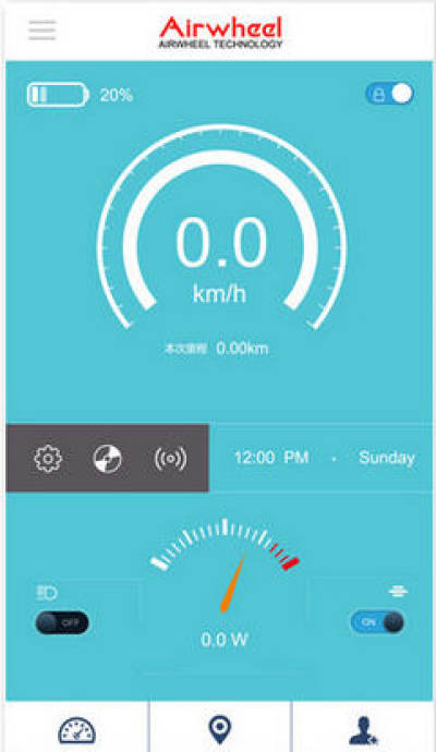 打开应用程序,之后点击无线互联网图标进行链接,就可以和你的airwheel进行互动了;在主界面可以看到当前速度,续航里程,轻松操控锁车、控制大灯、氛围灯。