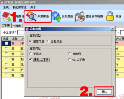 打开客户端后,点击工具栏上的 采集房源 按钮,选择好您要采集的网站后点击确认按钮,在弹出的列表中选择一条房源后,点击获取房源就可以了,详情见下图