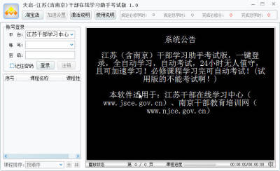 天启江苏南京干部在线学习助手是一款适用于江苏地区的自动学习教育软件,可以帮助用户自动挂机学习和考试,支持多帐号登录,支持加速学习,需要的朋友可以下载体验一下。