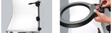 3:将蓝牙电动转盘置于PC扩散板上方,部分产品需要时(例如珠宝拍摄)可以安装上RGB灯。将各部分产品接通电源,调节仪器,将相机置于支架上,便可以拍摄产品了。另外使用拍拍360产品,便可以进行全景拍摄。