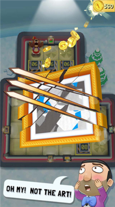 笨熊大战名画是一款非常有趣的休闲类玩法手游,游戏中玩家需要控制一只熊去破坏各种名画,而操作方式就是点击,指向一个方向,笨熊就会向那里滚去,但是每关都是有步数限制的,不能乱点哦!