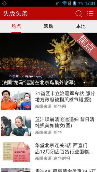头版头条,“指掌之间,知晓天下,有价值的新闻汇聚,各大媒体当天权威报道。头版头条是一款全新的新闻APP,旨在第一时间将全网有价值的资讯推送到您的手中,让您轻轻松松滑动手机,天下大事全知晓。头版头条不追求单纯的信息聚合,而是根据当下人们的阅读需求,力求在碎片化的阅读中,传达最有价值的资讯和新闻。头版头条给予您的不单单是新闻的获取,还有阅读的乐趣。头版头条的内容涵盖了国际、国内、社会、军事、财经、体育、娱乐、科技、汽车、房产、教育等众多领域的权威资讯,当您尽情阅读时,头版头条是您的个人新闻库,当您需要分享时,头版头条是您与朋友沟通的桥梁。您可以尽情将自己感兴趣的新闻分享到微信、微博等平台上,与朋友们畅聊评论,表达自己的观点。