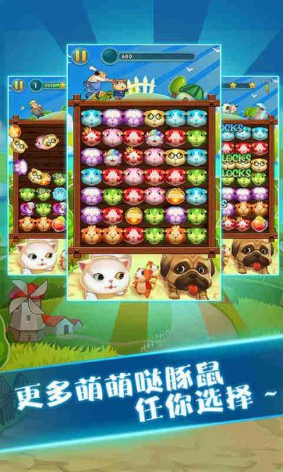 奔跑吧豚鼠是一款创新的三消游戏,不同于一般三消游戏移动单一元素去达到消除目的,本作需要整排整列的移动们,以达到消除效果。更加的考验玩家的消除技巧,更加的富有挑战和趣味。游戏画面清新萌趣,音乐轻松明快,多用暖色彩系,配有闯关模式和无尽模式,满足玩家的各种游戏体验。
