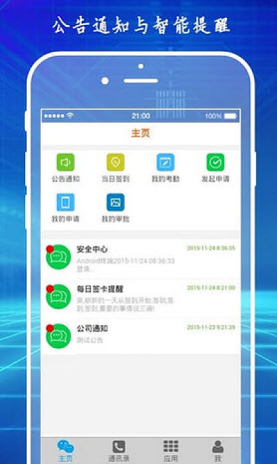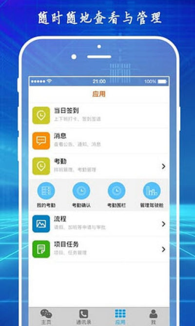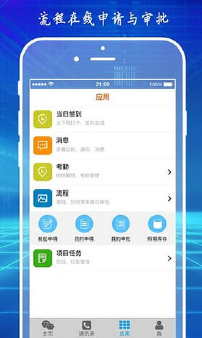 3.一线员工通过移动应用解决申请难,查看难。功能涵盖:手机定位签到、任务管理、差勤申请、加班申请、任务审批、排班查询、消息推送、工时查询、假期查询等功能。