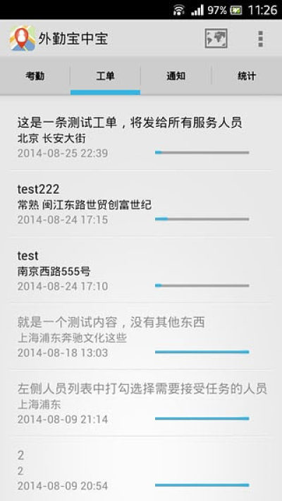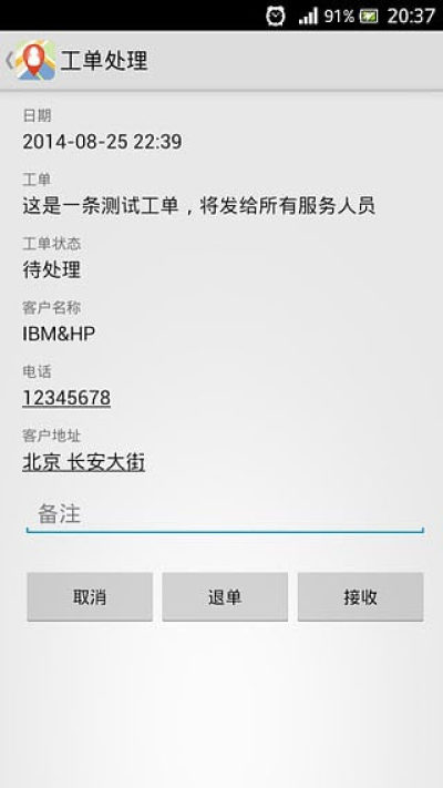 5.任务下达:可对每个外勤人员发送任务工单,外勤人员在手机上点击工单即可进行回复:是否接受此任务?何时可以到达现场?现场情况如何?处理情况如何?