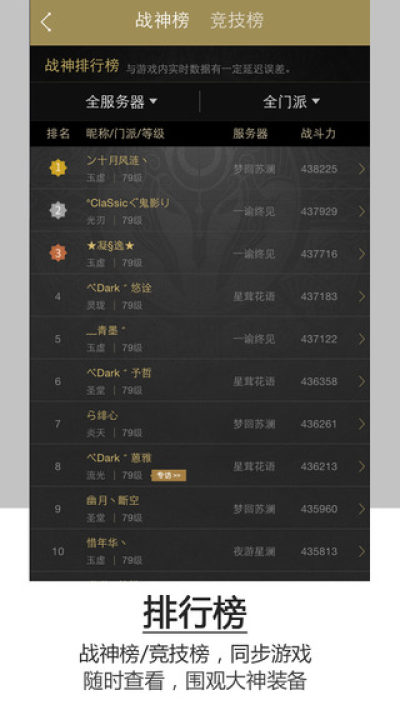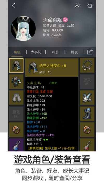 角色、装备、好友、成长大事记数据同步游戏,随时随地手机浏览自己的酷炫角色、极品金装、个人成就,还能分享给小伙伴,炫耀一把!
