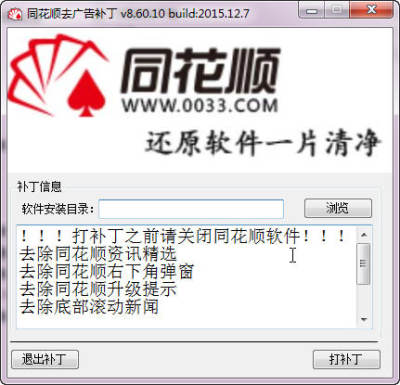 同花顺去广告补丁是一款由镰刀软件工作室推出的去广告补丁,主要针对同花顺软件,可以帮助用户去除同花顺资讯精选、同花顺右下角弹窗、同花顺升级提示、底部滚动新闻、解盘等等广告,不必再受广告打扰,需要的朋友可以下载体验一下。
