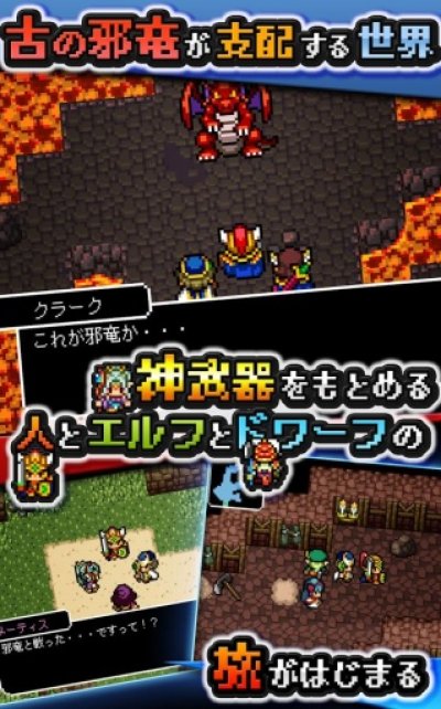 本作是一款采用令人怀念的8bit风格呈现画面来推进故事发展,并由知名游戏作曲家笹井隆司负责游戏的音乐部分。游戏的故事背景描述了一个由邪龙支配的世界,为了对抗邪龙的肆虐,人类、妖精与矮人决定联合起来,并一起展开冒险旅程四处收集神武器来对抗邪龙!而除了壮阔的主线故事之外,游戏中也将会收录各式各样的隐藏迷宫与支线剧情等丰富内容,让玩家们在主线探索之余,也能通过其他隐藏要素获得更多游戏乐趣!