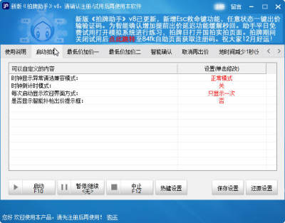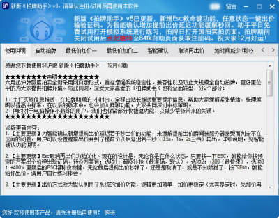 1. 【主要更新】为智能确认新增提前出价延迟若干秒出价的功能,来缓解提前出价瞬间被服务器接受而判定不在区间的问题,用户可以设置提前出价并到了提前价以后延迟若干秒(0.5s,1s,2s三档)再出。详细说明,见智能确认功能说明。