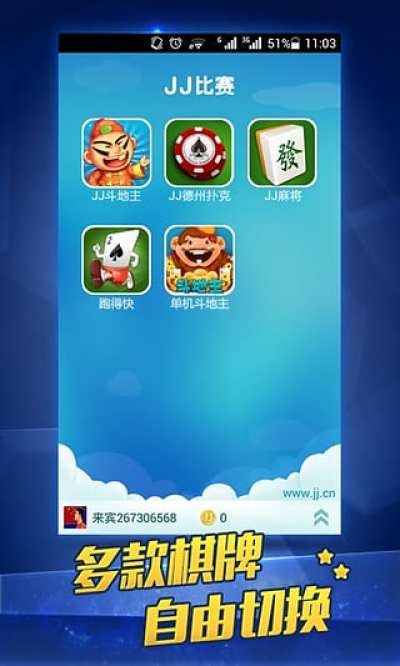 JJ比赛汇集了斗地主、德州扑克、经典麻将、二人麻将等多款棋牌游戏,启动后可在游戏间自由切换,手机版与PC版实现数据互通,让您随时随地享受游戏的乐趣!特有的社区平台,完善的账号体系,全新的兑奖中心界面,丰富的奖品体系,更多功能等您来体验!〓〓〓功能简介〓〓〓