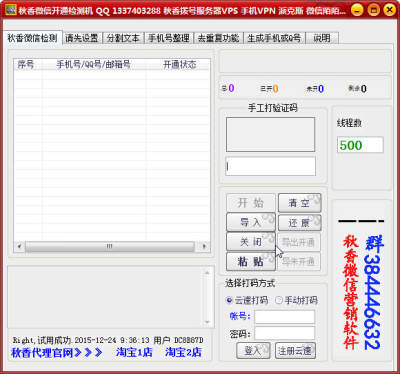 方法二:不验证IP,也可检测,量也不算少.点左上“秋香微检测”,复制号码,点"粘贴",等完全导入完成,就可以点“开始”,这时"开始"按钮变灰,啥都不要管(可最小化),直到"开始"按钮重新可用时,有音乐响起,就检测好了