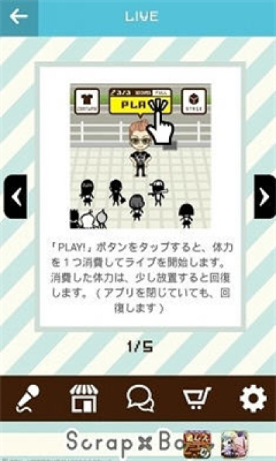 在游戏中,主人公是一名在偶像事务所工作的新任经理人,但去报道的第一天就被社长告知:“咱们事务所混得最好的偶像组合跳槽了!”震惊之下还被指派了一个重要任务,就是要去寻找新的偶像候补生,并把他们塑造成真正的偶像。男生们要在街头表演LIVE,然后通过LIVE收集观客们的爱心,提升等级。菜单左边数起第一格就是LIVE的图标。表演需要消耗体力,一共有三点,一分钟回复一点,所以三分钟左右体力就回满了!