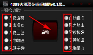 4399火线精英香香辅助,主要为火线精英玩家提供人物透视、狙击准心、人物上色、无限子弹、自动瞄准、暴力射击等实用功能,有需要的朋友可以下载使用。