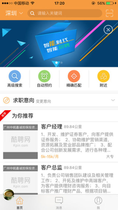 酷聘,手机上一款非常高效的求职招聘应用,一键预约,轻松求职,智能人工服务,直接以预约的形式面试,不过目前主要企业招聘都是来自深圳地区,其他的地区比较少。