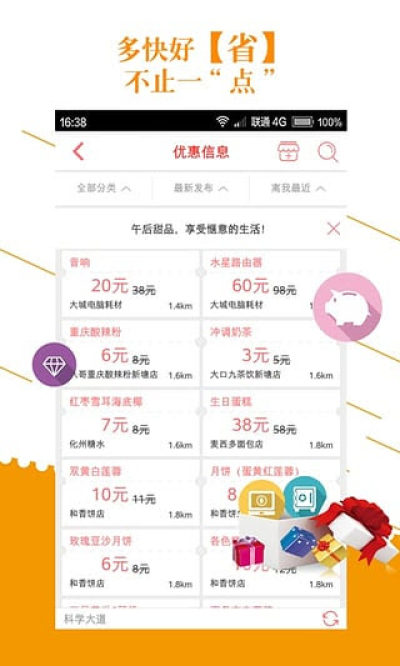 周边优惠APP是一款融合了购物、分享、交流、服务为一体的新型020生活导购平台,以用户附近的优惠服务为核心,为广大用户提供真实海量的促销打折等优惠信息,您可随时随地查看周边商铺发布的优惠信息和代金券信息,哪里优惠去那里,是您生活中不可缺少的省钱能手。买东西周边优惠帮你降低购物风险,出行还有随身保镖为你保驾护航;有周边优惠,生活更无忧。