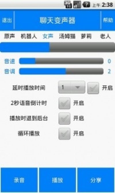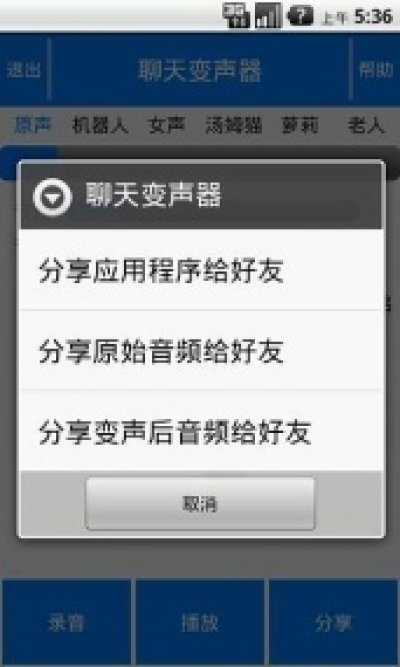 聊天变声器是一款支持微信变声以及各种声音效果变化的声音处理软件,包含系统预定义的汤姆猫、男声、女声、老人、机器人等效果,还支持用户自定义切换各种声音效果,并可以通过QQ、邮件等方式将变声后的音频共享给好友,更重要的是它支持通过微信语音发送变声后的声音。