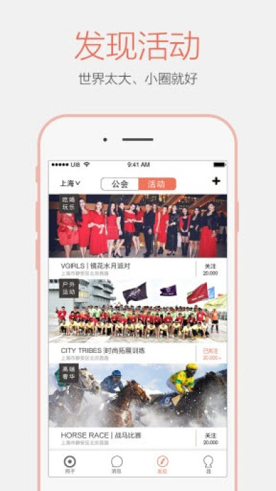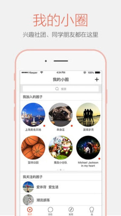 【发现圈子】通过搜索体育、时尚、交友、读书等关键字,找到和自己兴趣相投的圈子。