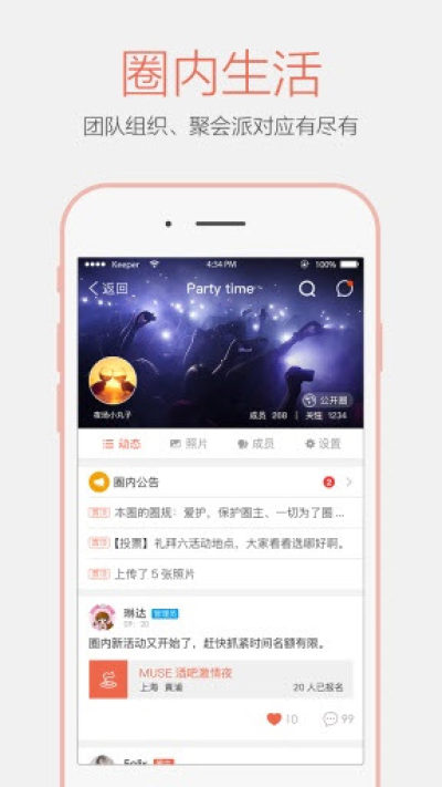 【分享内容】圈内成员可随时浏览圈内新鲜事,也可以自己分享图片、视频、文字、发起投票、组织活动等。