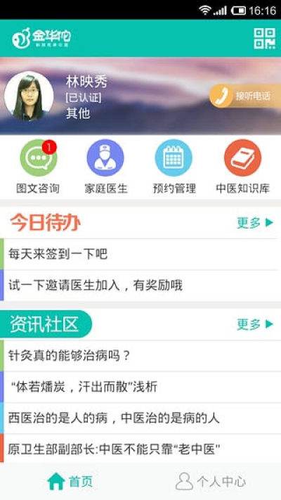 金华佗中医面向中医医生,中医药剂师等医务工作者,通过移动云平台服务,为中医药工作者提供图文咨询、电话咨询、预约挂号、家庭医生、患者管理、健康档案管理等医患交流功能及中医知识库、行业资讯等工具服务;同时也为广大中医药在校学生提供知识服务及资讯服务。