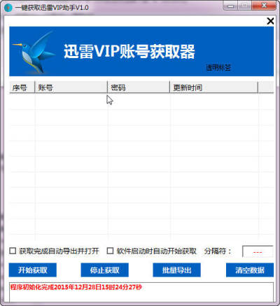 迅雷VIP帐号获取器(一键获取迅雷VIP助手)是一款绿色小巧的迅雷会员帐号获取工具,软件操作简单,功能实用,需要的朋友可以下载体验一下。