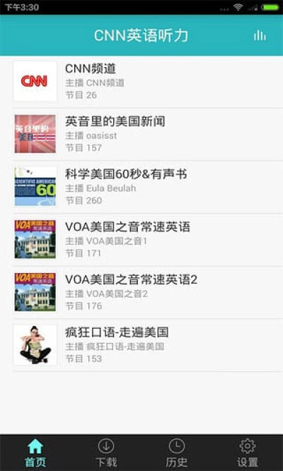 软件内默认推荐一些CNN相关的学习材料,用户可以自行添加更多诸如"英语听力","英语口语"等其它学习教程。