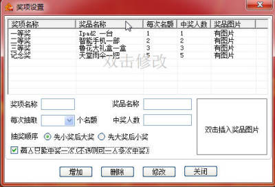 在[奖项设置]窗口,可以添加、删除、修改奖项及奖品名称、中奖人数、每次抽取人数奖品图片等,并可以设置抽奖顺序,抽奖模式(设置是否一人可以多次中奖)。