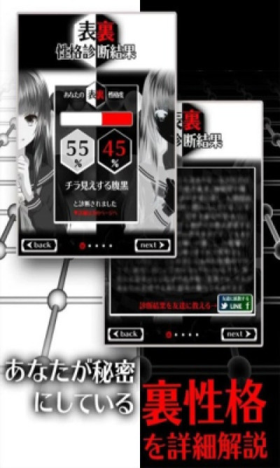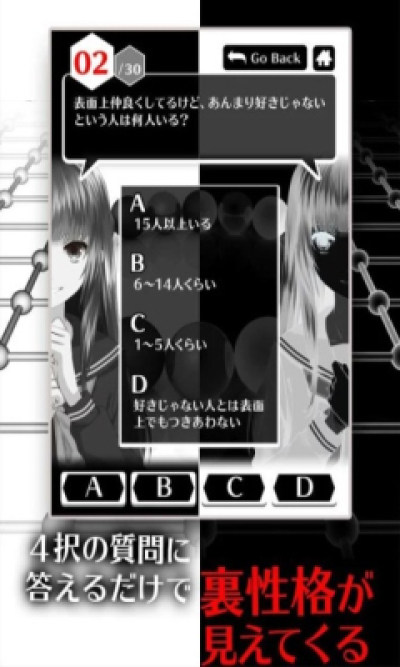 表里性格诊断是一款日系风格的心理诊断游戏,游戏中怪异的少女等你来进行鉴定,通过回答问题和判断来进行诊断,非常有趣的游戏,快来下载吧。
