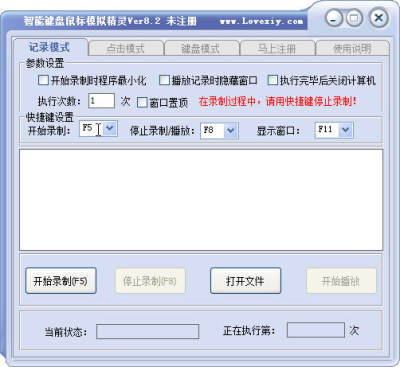 智能键盘鼠标模拟精灵是一款键盘鼠标模拟类软件,完全可以代替你的双手,帮你完成你需要的点击任务,本软件采用三种模式来满足各类用户的需要,记录模式可以方便在办公及其它商务软件操作需要,如果你需要在电脑上重复某个动作,那么本软件将是你最佳的选择,点击模式方便在网络中做网赚的朋友,做广告点击网赚时,需要通过大量的鼠标动作来完成广告点击任务,本模式将解放你的双手,让软件自动完成你的任务,键盘模式可模拟键盘按键,爱好玩游戏的朋友在游戏中需要大量的鼠标点击动作和键盘按键操作,如(在某个时间需要复制装备),此动作在本软件可以很容易的完成,为你解决各种鼠标点击键盘按键带来的麻烦!