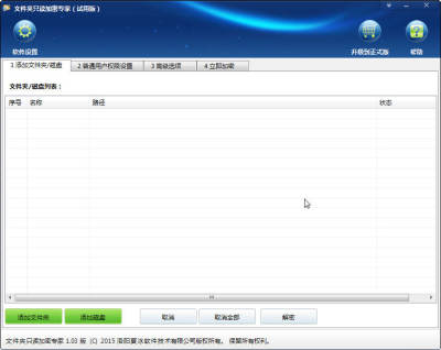 夏冰文件夹只读加密专家是一款简单但是专业的文件及文件夹加密界面工具,可以帮助用户快速对重要文件或磁盘进行加密解密操作,可选择加密难度,可针对不同的用户设置不同的权限,加密后的文件具备防复制、防删除、防移动、防修改、防另存为等功能,有效保护文件及隐私安装,需要的朋友可以下载体验一下。