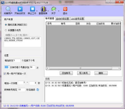软件支持多帐号批量加好友,支持同城好友随机采集及圈子成员批量采集,集成adsl拨号换ip、数据库等功能,可查看并导出好友报表!