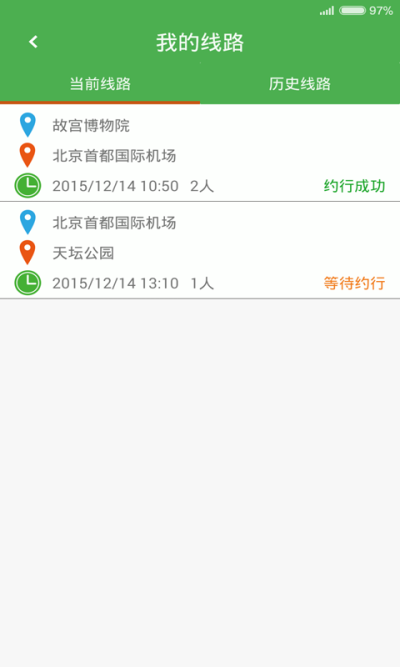 不同场景线路发布,如机场、高铁/火车站、上下班、城际;线路匹配即时消息通知;当前/历史 线路信息查看;“重新约行”与"约行历史"查看。