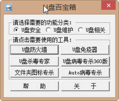 U盘维护和U盘相关三大类软件,具有防火墙、病毒免疫、U盘专杀、U盘修复、痕迹清理、格式化、U盘检测及加密等功能。