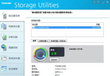 下好Storage Utilities工具箱并安装,在驱动器信息里可以看到工具箱已经支持东芝Q300了,点击下图里的SMART按钮可以查看SSD的SMART状态信息。