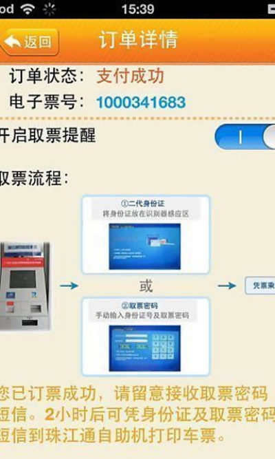 在购票成功后,软件能自动检测未取票订单,并向用户询问是否需要开启取票闹铃,对其进行取票出行的提醒。