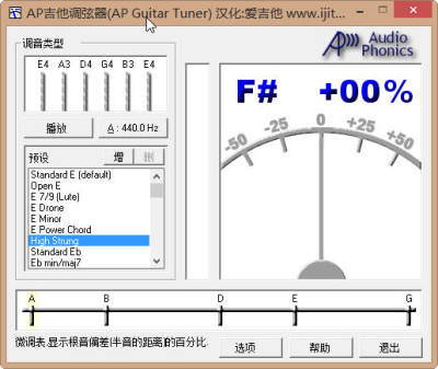 AP Guitar Tuner是一种非常优秀的吉他调音软件,该软件能够非常精确的对吉他进行调音,精度可以达到几音分,并预置多种自定义调弦方式、而且可以自由设定国际标准音。
