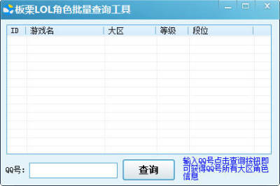 板栗LOL角色批量查询工具,主要可帮助用户查询任意QQ号在LOL所有区的游戏ID以及段位,有需要的朋友可以下载使用。