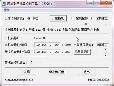 2. 本软件就是解决这个问题,一台机器运行控制端,其它机器运行受控端,控制端机器的鼠标和键盘的操作实时广播到受控端机器,N+1台机器就同时操作了,N+1倍的效率啊。这个软件也可以叫做网络鼠标键盘操作广播工具。