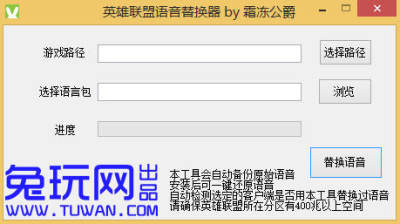一键式语音替换工具,方便不了解英雄联盟客户端的玩家使用,方便快捷的进行日服语音的替换,当然也可以替换其他语言(英语、韩语)等。