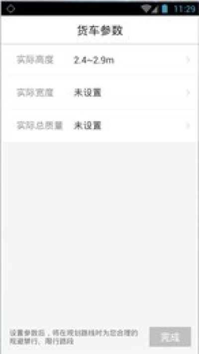 使用屏幕底部(横评模式下为左侧)的导航快捷图标,直接进入导航模式;添加了经由地导航,也就是说支持除了起始地之外的第三个途经点导航,极大的解决了货运司机到达中转地点后再次开启导航的繁琐操作。确定货车的各项参数即可开始导航,除此外,在货车参数选项页面中还预留了常规的“小车路线”选项,也就是直接使用常规导航,不考虑车辆高度、重量等道路因素。