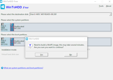 下一部就是选择安装的磁盘以及引导启动的磁盘,去定后会提要要求进行一个 PE 系统的下载安装,点击「Yes」它会自动进行下载和安装。