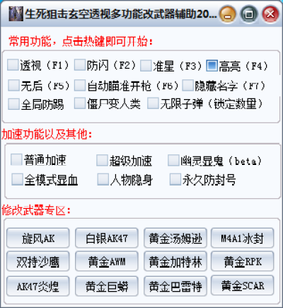 生死狙击玄空透视多功能刷枪万能辅助,主要包含透视、修改武器等实用功能,有需要的朋友可以下载使用。