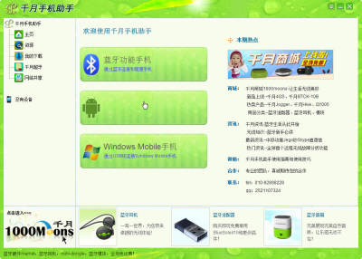 千月手机助手需要配合千月收费授权版本使用,只需要序列号激活千月蓝牙软件版本,即可免费享用,并且可享受千月技术专家提供的在线客服支持。千月手机助手是一款方便易用的手机管理工具。该软件可以对手机中的联系人、短信、各类文件及应用程序进行管理,在支持数据线连接的同时,还支持蓝牙无线连接,界面美观,为用户提供最全、最新、最热的手机应用免费下载,和丰富的业界资讯。