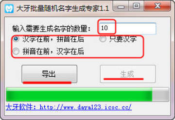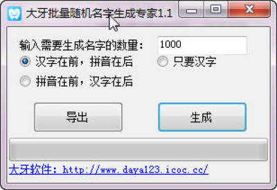 注册网站帐号、邮箱帐号、QQ、有效昵称等情况都需要起名,起名可是一个头疼事,大牙批量名字随机生成器可以帮助用户快速批量生成名字,即可用作帐号昵称,也可用作姓名取名,简单小巧,需要的朋友可以下载体验一下。