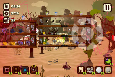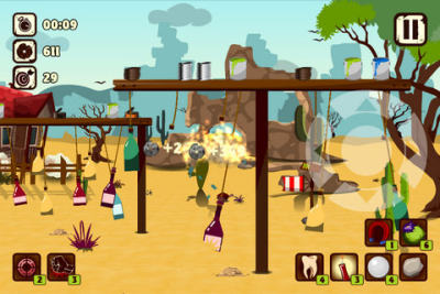 这是一款第一人称休闲射击游戏,游戏中玩家要使用一个简易弹弓,通过点击屏幕进行蓄力,拖动手指即可调整弹弓瞄准方位,松开手指发射石子,将排列出来的瓶瓶罐罐全部击倒。