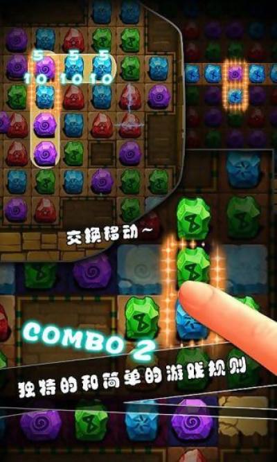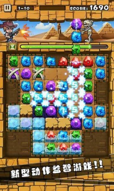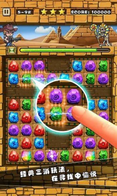 在游戏中玩家将深入神秘的埃及王朝,打破法老的诅咒。拖动连接3个以上的宝石进行消除,消除的分数达到游戏要求就可以过关了。