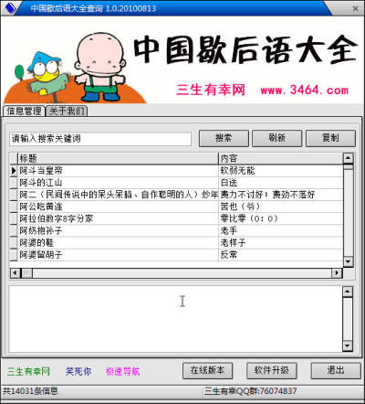 歇后语是中国人民在生活实践中创造的一种特殊语言形式,是一种短小、风趣、形象的语句。"中国歇后语大全查询"收集了常见歇后语14000余条,可对歇面、歇底分别进行强大的搜索查询。只要你对歇面或歇底只记得一个字,即可将整条歇后语完整地搜索出来。