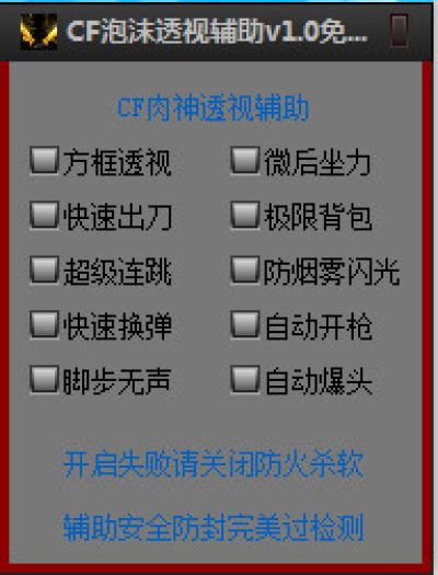 CF泡沫透视防封辅助,绿色无毒无插件,主要包含方框透视、自动开枪、自动爆头、微后坐力等强力功能,有需要的朋友可以下载使用。